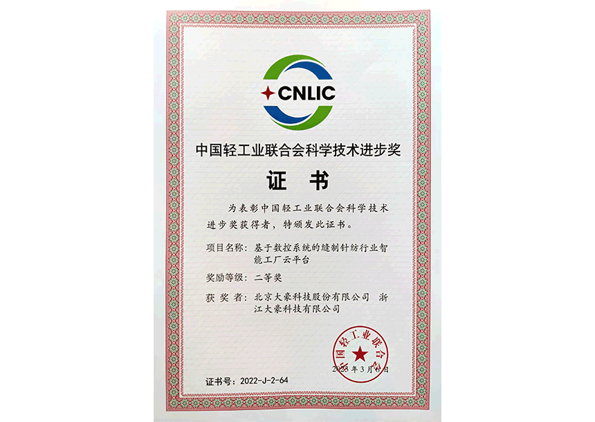 • 中国轻工业联合会科学技术进步奖二等奖-基于数控系统的缝制针纺行业智能工厂云平台