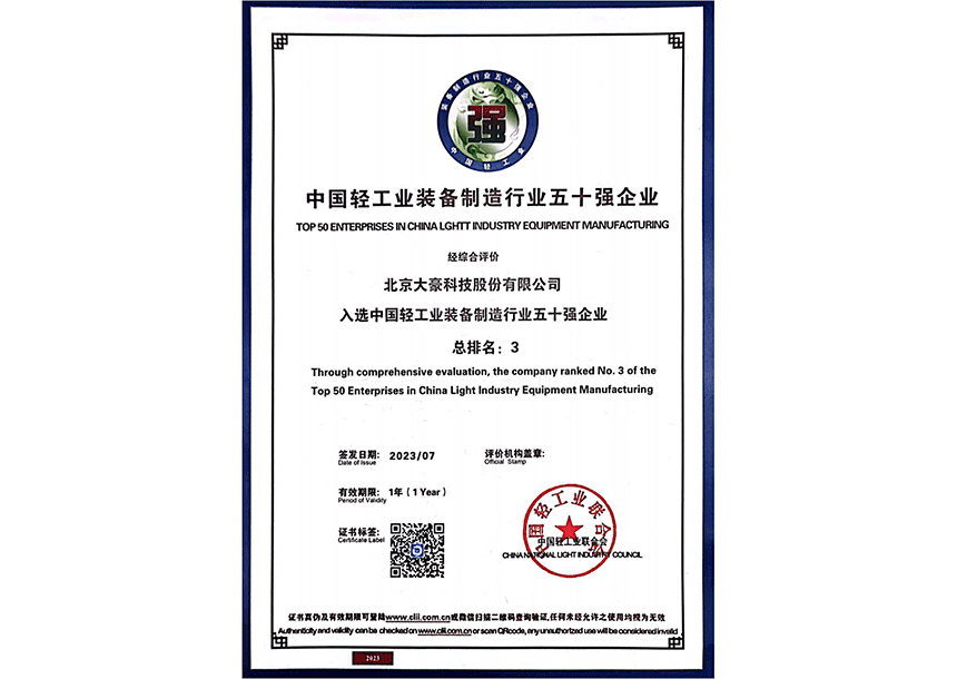 • 2022中国轻工业装备制造行业五十强企业第3名