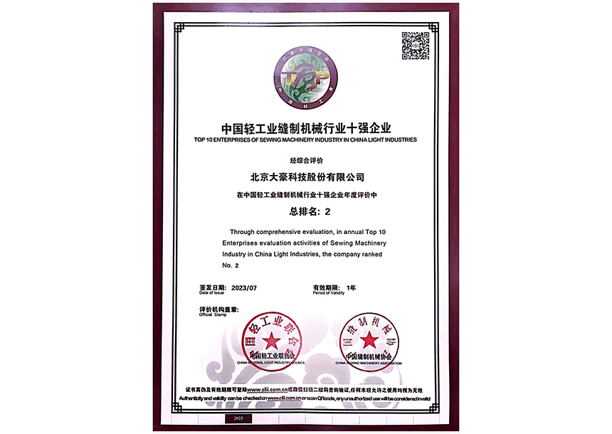 • 2022中国轻工业缝制机械配套行业十强第2名